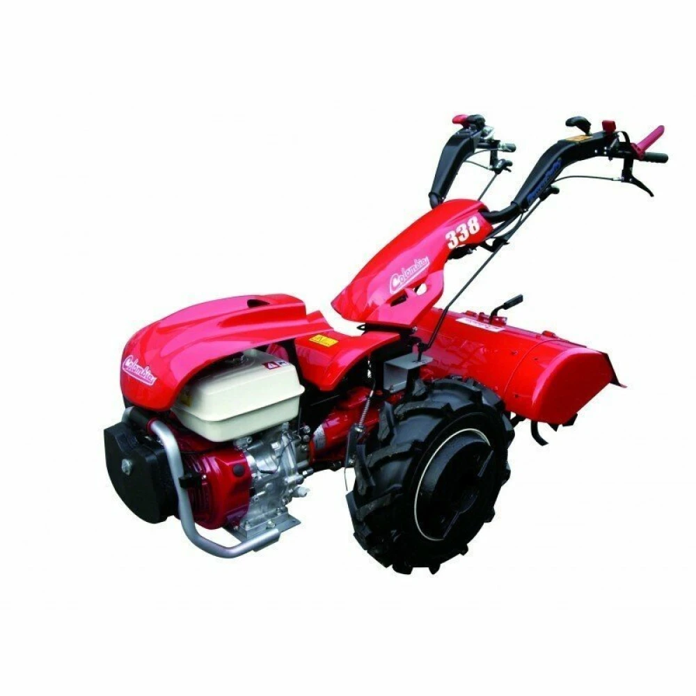 Tout équipé: fraise arrière rotative 66cm avec rallonge, moyeux réglables, roues 500x10, masses et contrepoids avant et chappe d'attelage.