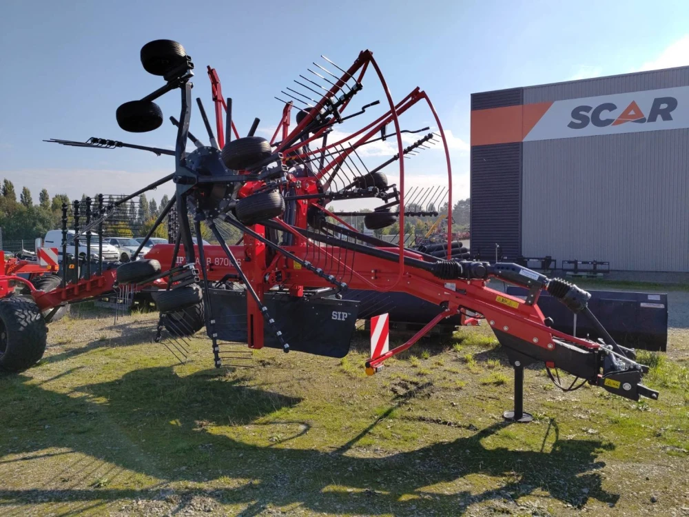 Trainé double rotor andain central, largeur travail 7.60m à 8.60m réglable hydrauliquement, rotor 3D Ø3.65m 2x 13 bras, attelage barre 2 points cat2, transmission cardan grand angle, 1 SE + 1 DE, réglage hauteur de travail mécanique, essieu tandem par rotor.